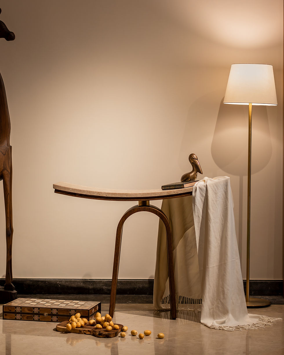 Travertine Equinox distils form to its essentials, conceived as a quiet silhouette of the equinox. Two solid volumes meet at a single point, where brass and wood intersect, creating a poised architectural balance. The console echoes Egyptian principles of mass and proportion, translated into furniture scale. Materiality remains fundamental: the travertine is carved from a single block and left in its natural state, its pores and tonal variations visible, while the timber retains its grain. Treated as presences rather than surfaces, both materials gain integrity over time. As a threshold piece, it embodies weight and near-weightlessness through precise proportion.